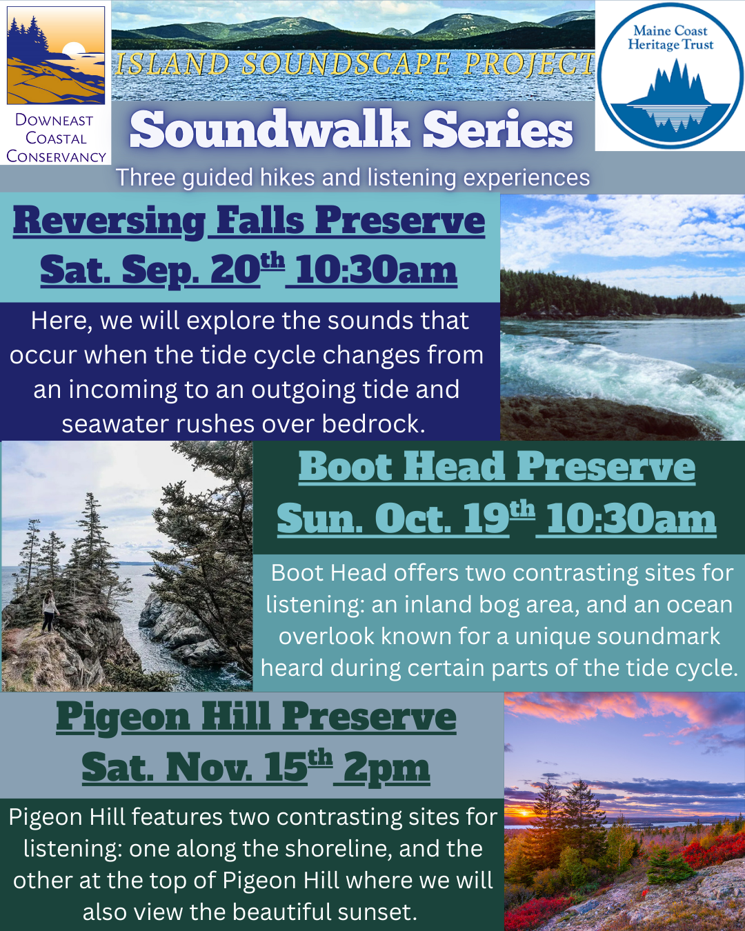 The Island Soundscape Project, in partnership with the Maine Coast Heritage Trust and the Downeast Coastal Conservancy, is hosting a series of guided walks focused on helping visitors to connect with place through listening. The primary guide is Dr. Karen Beeftink, Associate Professor of Outdoor Recreation and Tourism at the University of Maine at Machias.